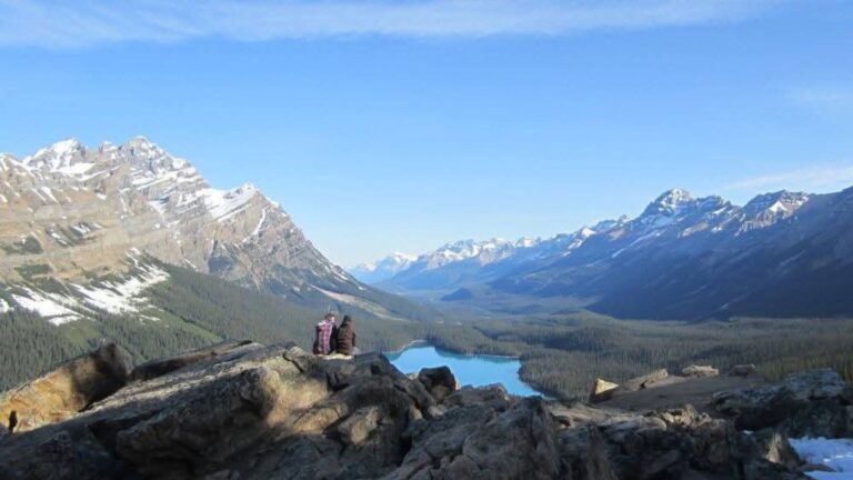Peyto Lake and its Icefields Parkway backdrop is possibly the most stunning lake in Canada if not the world. It’s an unmissable experience and easily reached via a 20-minute path from the car park. Of course, this accessibility makes it unbearably crowded in peak season at peak times. Beyond going early, late or in off-season, we recommend going beyond the Peyto Lake Viewpoint and above to Bow Summit Lookout.